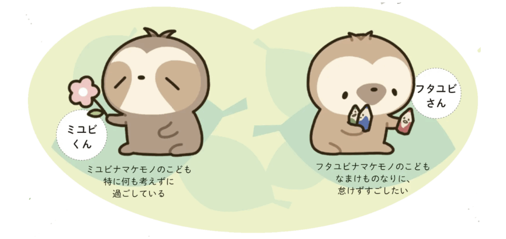 フタユビさんは、フタユビナマケモノのこどもです。ミユビくんとは兄弟ではなく、たまたま出会ってなんとなく気が合うので一緒に過ごしているという設定が素敵ですね!