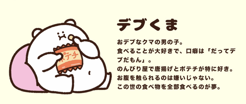 デブくまの最大の魅力は、「デブなことは悪くない」というポジティブなメッセージです。痩せたいと思いながらもポテチを食べてしまう、そんな等身大の姿に多くの人が共感しているんですね。