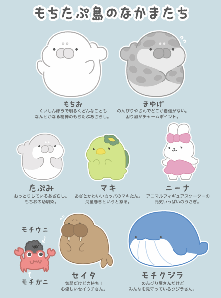 「もちたぷ島」という場所で、もちたぷな仲間たちと一緒に平和に暮らしているんです。まるまるとしたハリのあるお腹と、ぷにぷにのほっぺたが特徴で、見ているだけで心がほっこりしちゃいます。
